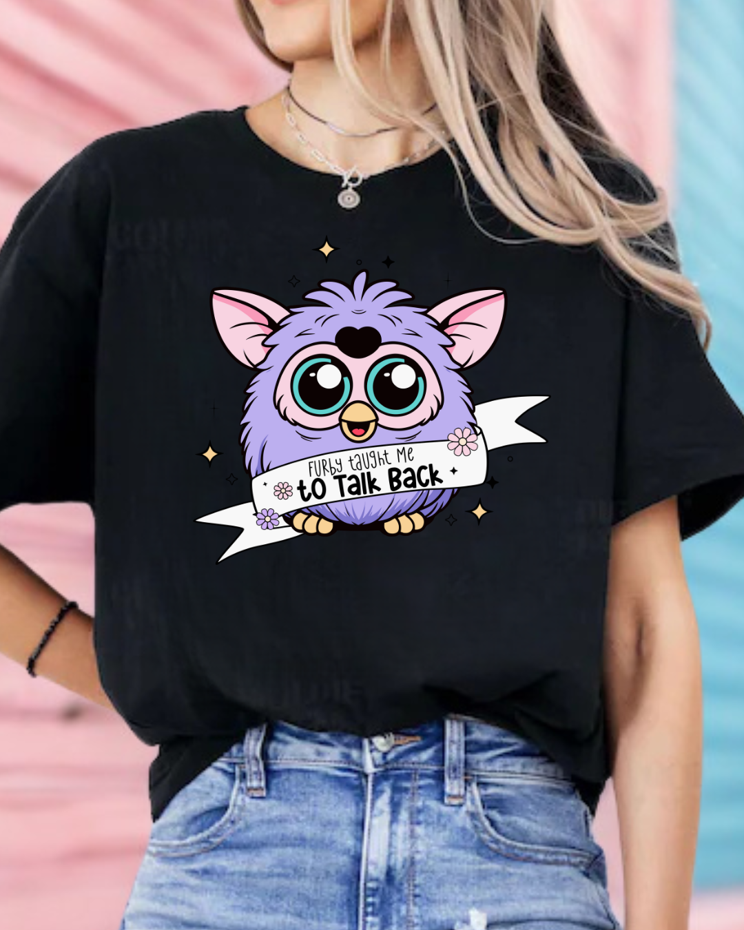 Get ready to turn back time with this hilarious Y2K Furby T-shirt. Featuring a playful and quirky design, this shirt is sure to turn heads and make people laugh. Perfect for nostalgia lovers and those with a sense of humor. Don't miss out on this unique piece!